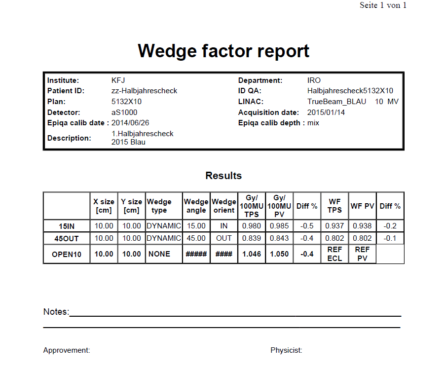 - calculation sheets and documentation of absolute dose measurements ("AbsDosimetry Linac"), and finally